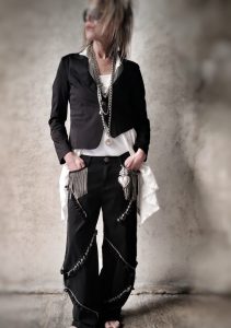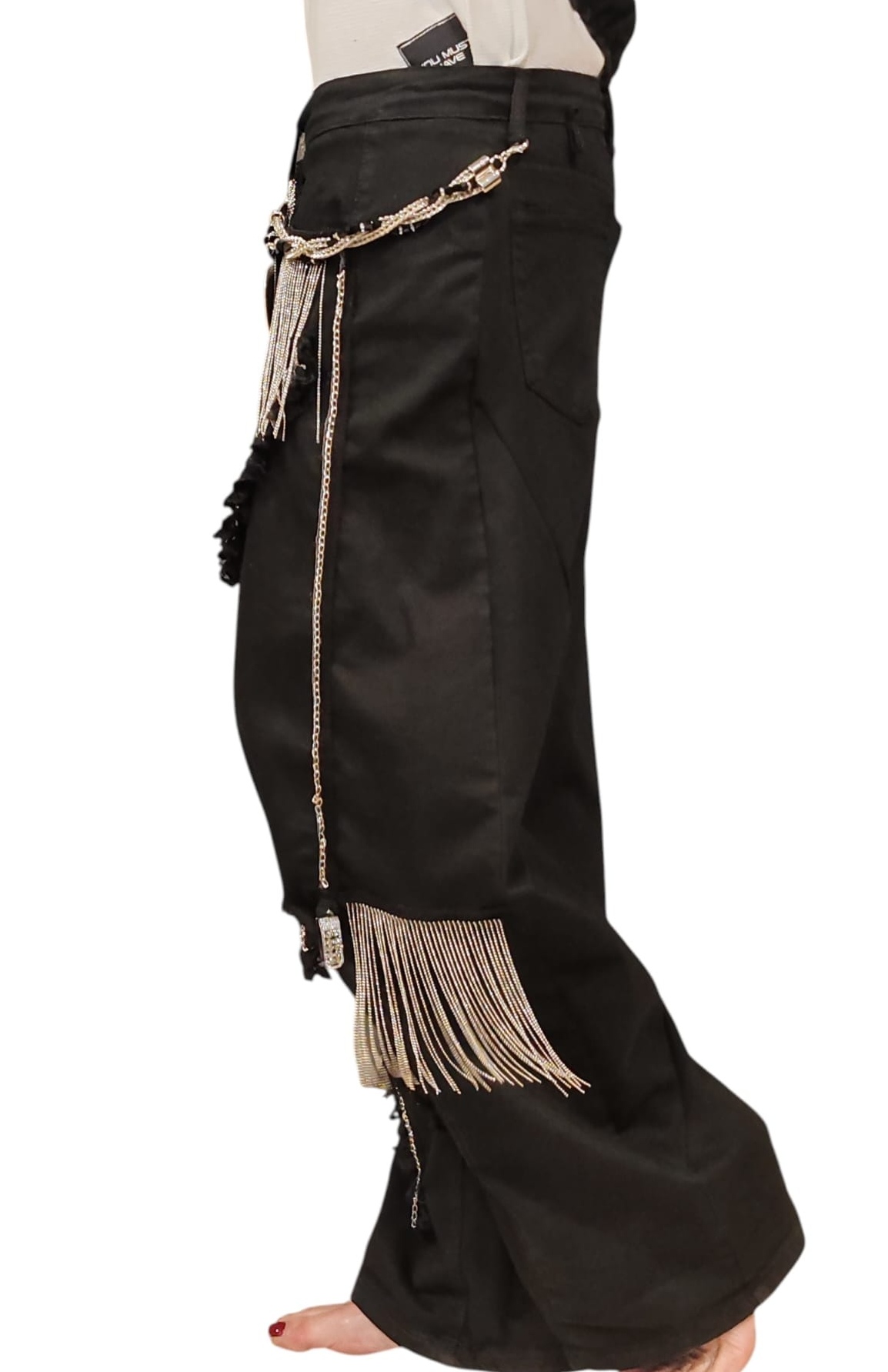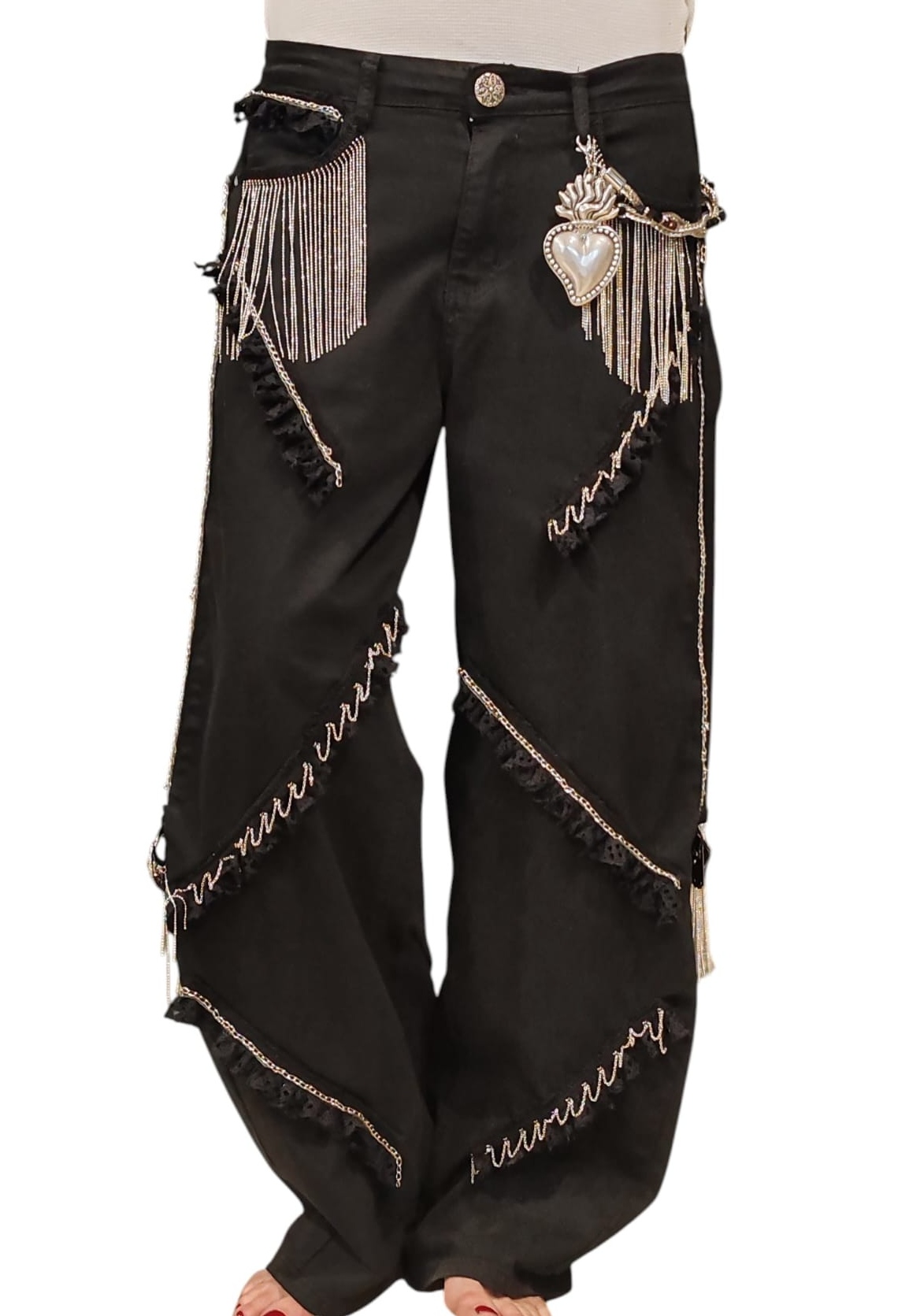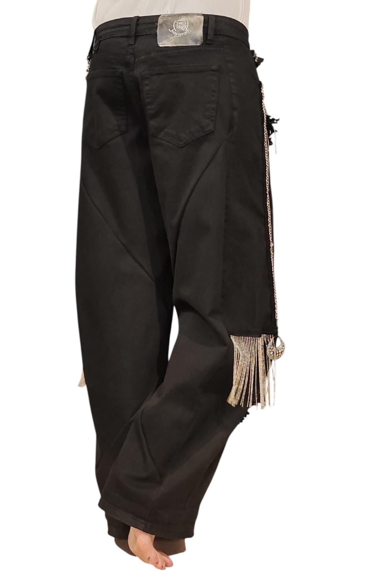 PANTALONE COTONE JEANS FORMA OVETTO CON TASCHE -ZIP- PASSANTI E APPLICAZIONI TAGLIA S NERO CREATIVITY ROOM -PROVOCATION MILANO-